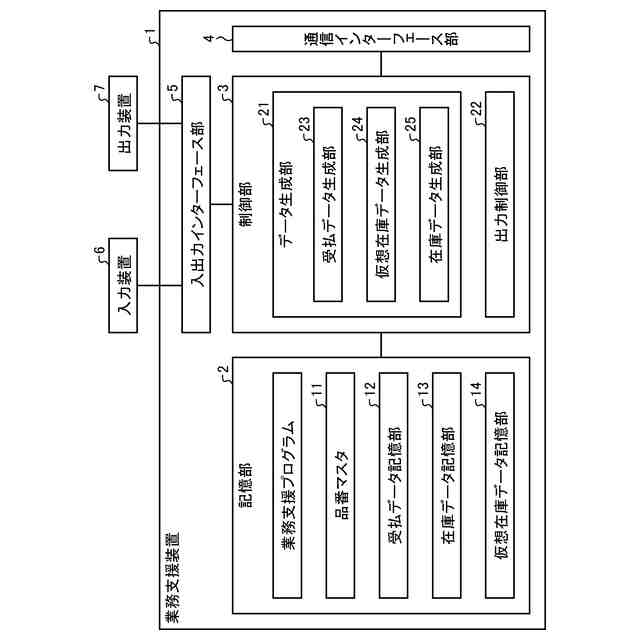 また、上述の課題を解決し、目的を達成するために、本発明に係る業務支援プログラムは、コンピュータを、商品の種類を示す商品分類及び時間と共に変化する商品の態様である商品状態を諸口受払単位として、同じ商品分類及び同じ商品状態の商品毎の受入数及び売上数に対応する在庫数を含む受払データを生成する受払データ生成部と、商品分類が指定された際に、受払データに基づいて、指定された商品分類毎及び商品状態毎の在庫数を示す仮想在庫データを生成する仮想在庫データ生成部と、生成された仮想在庫データを、出力装置に出力する出力制御部として機能させる。