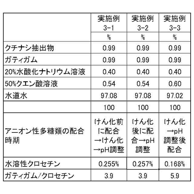 [7]クロセチン、ゲンチオビオース、アニオン性多糖類、酸及び一価の塩基を含む水溶性クロセチン含有組成物中のクロセチン及びゲンチオビオースの安定化方法であって、i)クロセチン配糖体を一価の塩基性化合物でけん化する工程、ii)アニオン性多糖類を配合する工程及びiii)酸性化合物でけん化後のpHを2.0~8.0に調整する工程を含む、安定化方法。