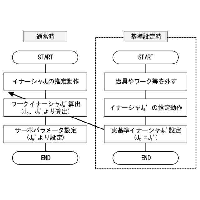 上記特許文献1および特許文献2の技術を用いたサーボパラメータ変更方法の一例を説明する。図5にイナーシャ推定およびサーボパラメータ設定の動作チャートを示す。まず、特許文献1等に記載の技術を用いて駆動系のイナーシャの推定を行う。次に、推定したイナーシャからワークイナーシャを算出する。そして、算出したワークイナーシャに応じたサーボパラメータを設定する。