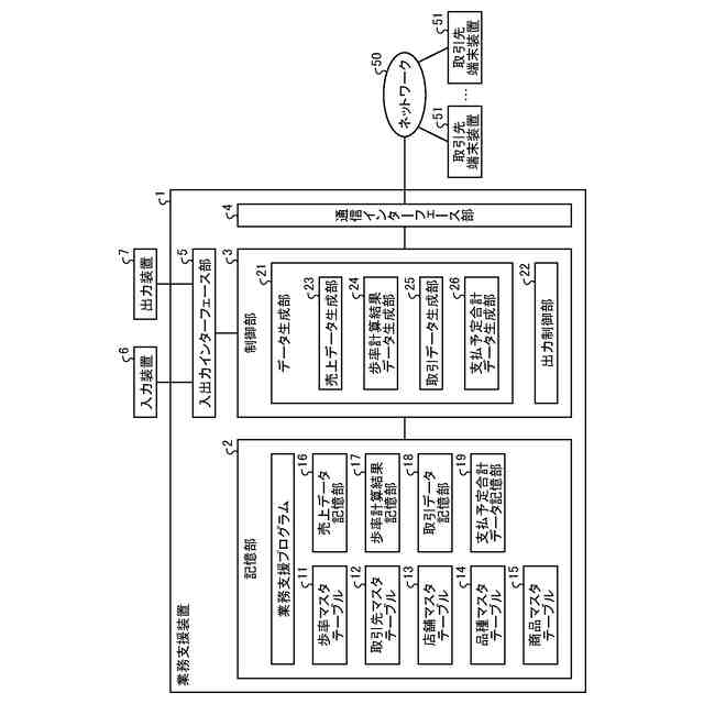 【解決手段】売上データ生成部が、商取引対象の売上入力操作に基づいて、売上日、取引先、商取引対象種別及び売上金額を含む売上データを生成し売上データ記憶部に記憶させる。歩率計算結果データ生成部は、少なくとも取引先毎及び商取引対象種別毎に設定された、全体の売上金額に対する取引先への支払金額の割合である歩率が記憶された歩率マスタテーブルを、商取引対象種別に基づいて参照し、取引先毎及び商取引対象種別毎の商取引対象の売上金額に、商取引対象種別に対応する歩率を乗算処理することで算出した、取引先毎及び商取引対象毎の支払金額に相当する歩率計算結果金額を含む歩率計算結果データを生成して歩率計算結果記憶部に記憶させる。出力制御部は、歩率計算結果記憶部に記憶された歩率計算結果データを出力装置に出力する。