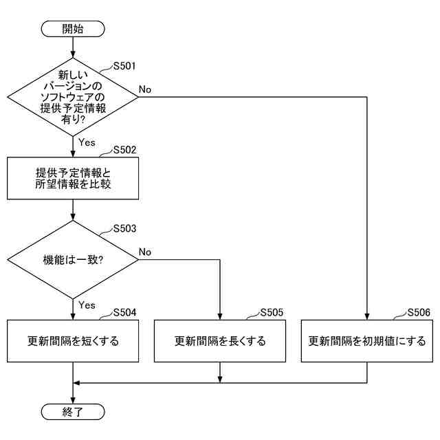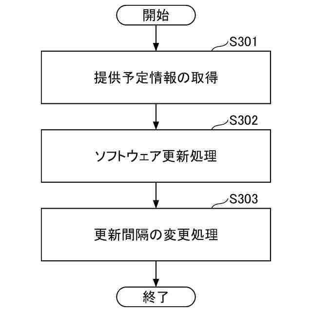 更新予定のソフトウェアをサーバから取得する間隔を変更することによって、サーバの負荷が分散される。しかしながら、ソフトウェアの品質に応じた更新間隔を設定すると、更新予定のソフトウェアを、ユーザが所望する機能が含まれているか否かに応じたタイミングで更新できない虞がある。