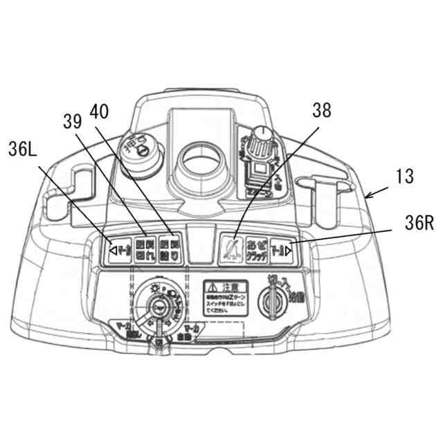 請求項2の発明は、操縦席20の前に設けるステアリングハンドル16下部の操作パネル13に着座警報を出力する警報器38を設けたことを特徴とする請求項1に記載の乗用作業車の操縦装置とする。