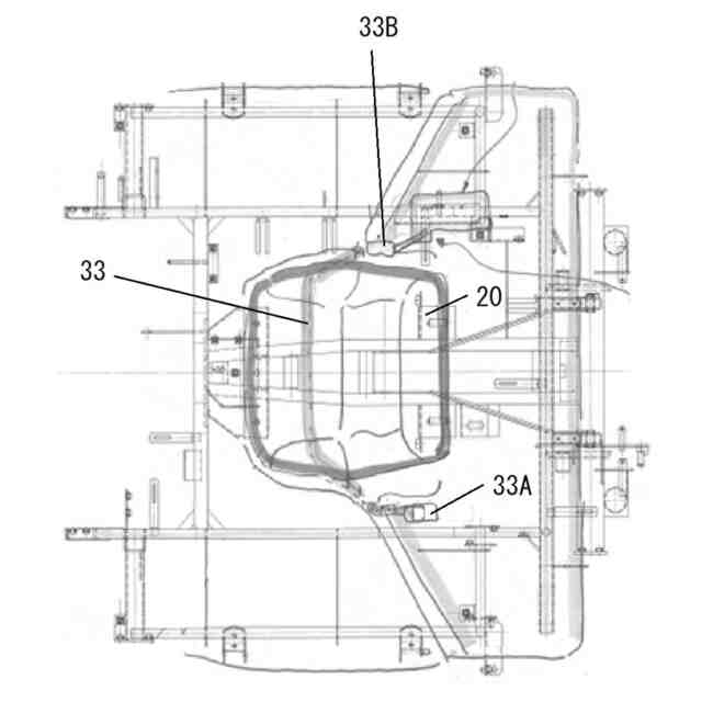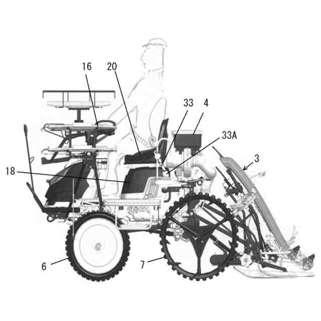 請求項3の発明は、エンジンカバー18上に設けた操縦席20の左側部にシートベルト引出部33Aを車体1に取り付け、操縦席20の右側部で車体1に設けるシートベルトロック部33Bとの間で操縦席20に座る作業者を保持拘束するシートベルト33を設けたことを特徴とする請求項1に記載の乗用作業車の操縦装置とする。