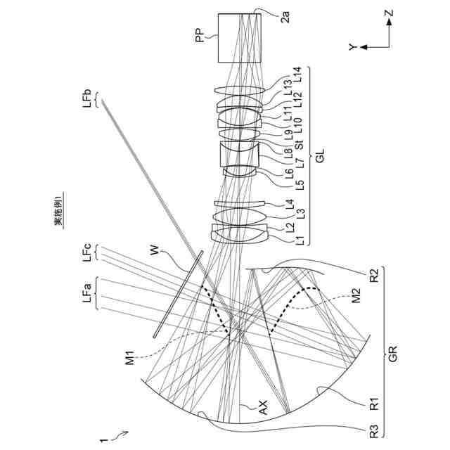 で表される条件式(1)および(2)を満足する。ここでは、上記シフトの量が最大となる状態において拡大像の中心に入射する主光線を中心主光線とし、中心主光線の拡大側結像面への入射角をαとし、中心主光線の光学窓への入射角をθcとしている。