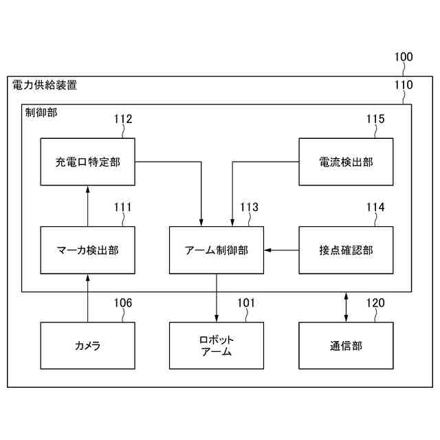 【解決手段】 電力供給装置は、移動体に電力を供給する電力供給装置であって、伸縮動作及び回転動作可能に設けられ、先端に電力を供給する供給部を備えるロボットアームと、画像パターンを有するマーカが取り付けられた前記移動体を撮影するカメラと、前記カメラによって撮影される前記マーカを含む撮影画像に基づいて、前記移動体が備える受電部を特定し、前記ロボットアームを制御して前記受電部へ電力を供給させる制御部とを有する。