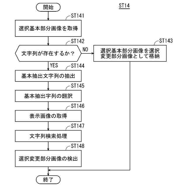 前記少なくとも一つの検索文字列のうち前記翻訳文字列と一致する文字列を決定認識文字列とし、前記実行直前表示画面の画像情報から、前記決定認識文字列を含むUI画像部分を前記選択変更部分画像とする画像決定処理とを含み、