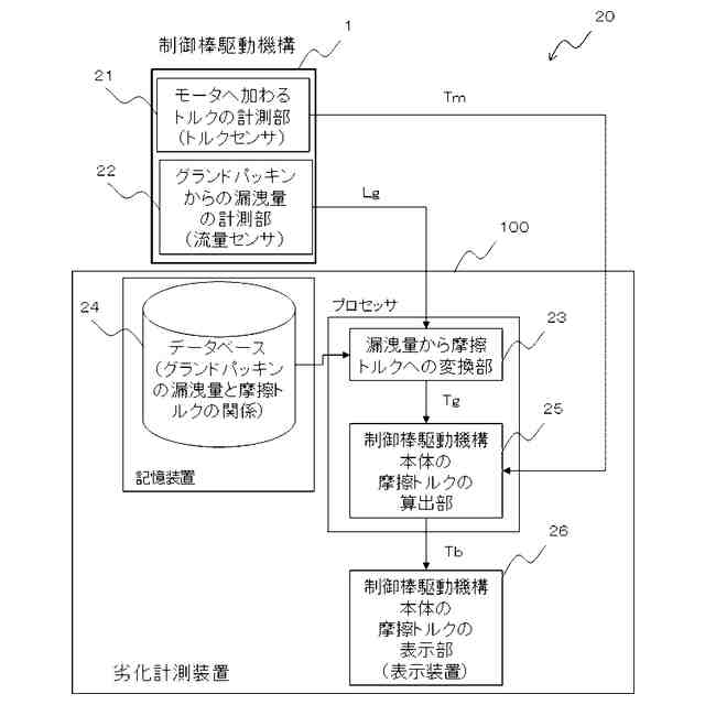 【解決手段】劣化計測装置100は、制御棒駆動機構1のグランドパッキン7からの流体の漏洩量Lgに基づいて、制御棒駆動機構1の劣化の指標(例えば、回転による摺動部分の摩擦トルク)を計算するプロセッサを備える。