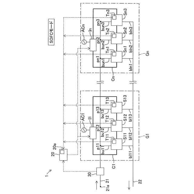 各前記セルスタックは、1又は複数の前記セルスタックを含む複数のグループ(G)毎に、電源(DC)又は負荷(I)を含む回路(C)に電気的に直列に接続されており、