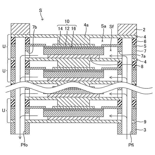 複数のセルスタック(S)であって、そのそれぞれが、固体電解質層(12)と、前記固体電解質層の表面側に積層配置された空気極(14)と、前記固体電解質層の裏面側に積層配置された燃料極(16)と、を含む固体酸化物形の電気化学単セル(10)を複数含む、複数のセルスタック(S)と、