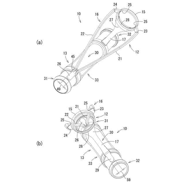 (1) 上記課題を解決するために、本件発明の第1側面の遊動式の釣糸ガイドは、釣糸を案内するガイドリングと、前記ガイドリングを保持する環状のフレームと、前記ガイドリングの軸芯方向の第1向きに延びる第1固定部を有し、前記フレームの周方向に離間する一対の第1支持部に取り付けられる第1支持脚と、前記第1向きと反対の第2向きに延びる第2固定部を有し、前記フレームにおける前記一対の第1支持部の間に設けられた第2支持部に取り付けられる第2支持脚と、前記第1固定部が固定される第1管部と、前記第2固定部が固定される第2管部と、前記第1管部および前記第2管部のうち少なくともいずれか一方より曲げ剛性が低い低剛性部を有し、前記第1管部および前記第2管部を連結する連結部とを備えたことを特徴とする。