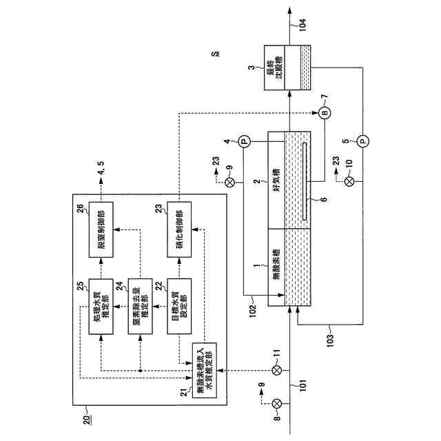 【解決手段】無酸素槽の流入水の窒素濃度を推定する流入水質推定部21と、反応槽の流出水もしくは処理水の窒素濃度の目標値を設定する目標水質設定部22と、流入水質推定部による出力値と、目標水質値設定部による設定値とを用いて、好気槽への風量を制御する硝化制御部23と、反応槽での窒素除去量を推定する窒素除去量推定部24と、流入水質推定部による出力値と、窒素除去量推定部による好気槽での窒素除去量の推定値とを用いて、反応槽の流出水もしくは処理水の窒素濃度を推定する処理水質推定部25と、処理水質推定部による出力値と、目標水質設定部による設定値とを比較し、反応槽内での硝化液循環量、もしくは最終沈殿池からの返送汚泥量を制御する脱窒制御部26と、を備える。