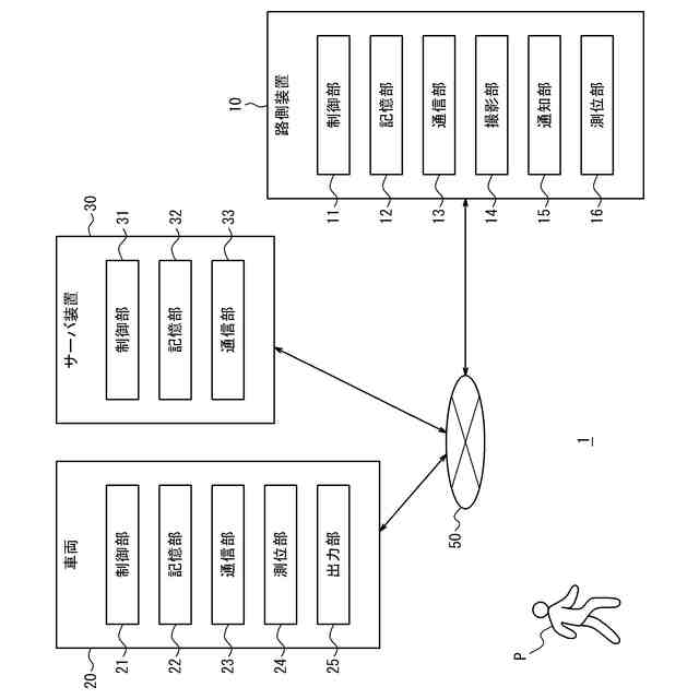 図1は、一実施形態に係る情報処理システム1の構成例を示す図である。情報処理システム1は、路側装置10、車両20、及び、サーバ装置30を備える。路側装置10、車両20、及び、サーバ装置30は、例えば移動体通信網及びインターネット等を含むネットワーク50と通信可能に接続される。