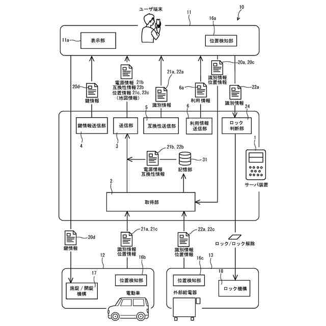(2)このようなサーバ装置は、前記取得部は外部給電器の位置情報を、前記外部給電器を識別する第2識別情報に紐付けて取得するものであり、前記記憶部は前記外部給電器と前記電動車の互換性に関する互換性情報を前記第2識別情報に紐付けて記憶しており、前記送信部は、前記被災地内に位置する前記外部給電器の位置情報及び前記互換性情報を、前記被災地内の前記ユーザ端末に送信するものであり、前記被災地内における前記外部給電器の位置が、前記外部給電器の位置情報に基づいて、前記ユーザ端末の表示部に地図表示され、前記互換性情報が前記表示部に表示されるものである、のが好ましい。
