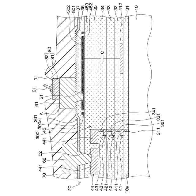 【解決手段】キャパシタCは、複数の配線部41~45のうちの基板10と配線層20との積層方向において対向する2つの配線部において、基板側10に位置する配線部を第1電極412とし、第1電極412を挟んで基板10側と反対側に位置する配線部を第2電極452として構成され、配線層20のうちの基板10側と反対側の一面300a上に配置された第2電極452と接続されるパッド部61と、パッド部61を露出させる開口部71が形成されていると共にパッド部61と接しており、絶縁膜よりも電界破壊強度が低い樹脂で構成された保護膜70とを有し、第2電極452と保護膜70との間には、配線層20の絶縁膜が配置され、パッド部61および第2電極452は、積層方向において、第2電極452の内側にパッド部61が配置されるようにする。