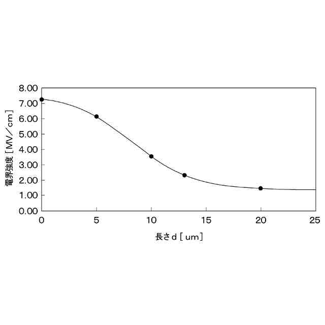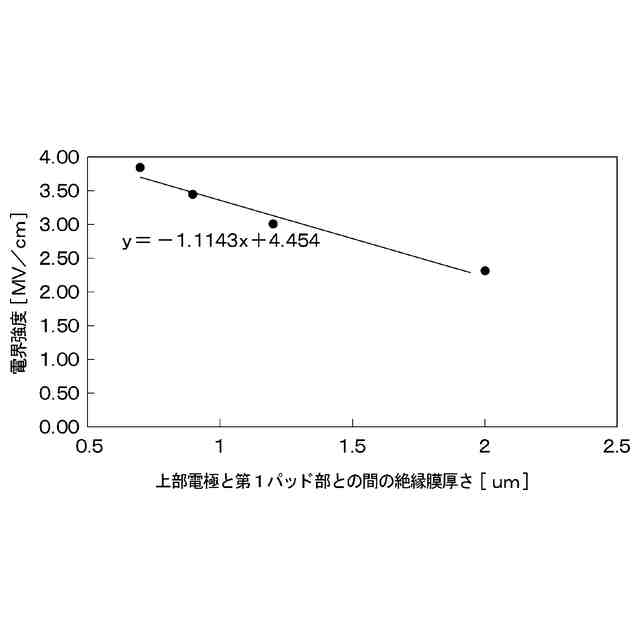 上部電極と第1パッド部との間の絶縁膜厚さと電界強度との関係を示す図である。