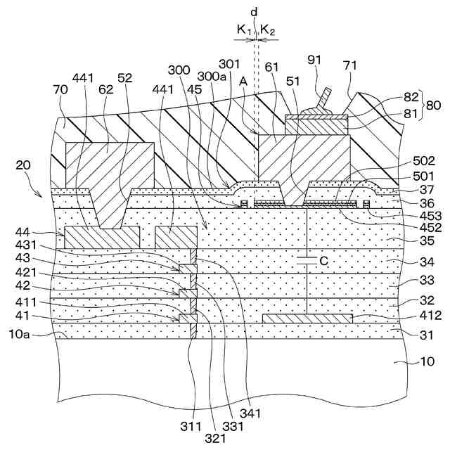 前記配線層は、複数層の絶縁膜(31~37)と複数層の配線部(41~45)とが交互に積層された部分を有し、