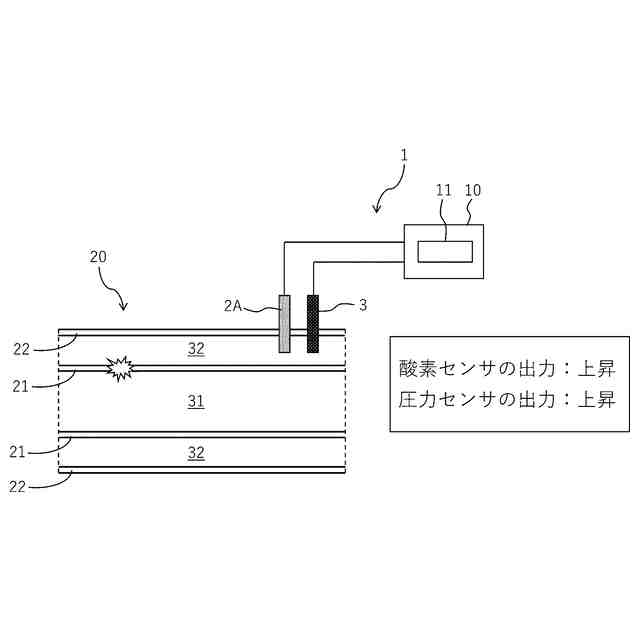 上記[1]から[3]の何れかの検知装置において、前記ガスセンサは、濃淡電池式の酸素センサであり、前記判定部は、前記酸素センサの出力が、前記略真空状態のときの出力と比較して変動した場合に、前記外管が破損したか、または前記内管が破損したかを識別して判定してもよい。