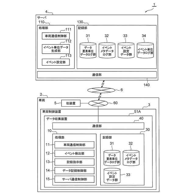 図1に示すように、本発明の第1実施形態のデータ収集システム1は、車両2とサーバ4とを備える。車両2には、データ収集装置51Aを有する車両制御装置3が搭載されている。なお、図1では、説明の便宜のため、代表的な車両2の一台だけが図示されているが、データ収集システム1は、複数の車両においてデータ収集装置51Aを有する車両制御装置3をそれぞれ備えていてもよい。データ収集システム1は、ネットワーク6を介して車両制御装置3のデータ収集装置51Aから複数の種類の時系列データであるデータ要素単位データログ群31を受信するサーバ4を備える。