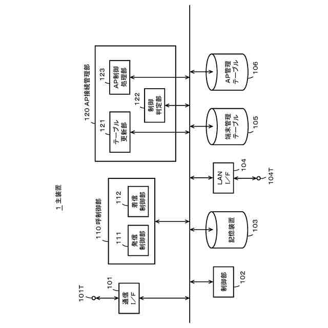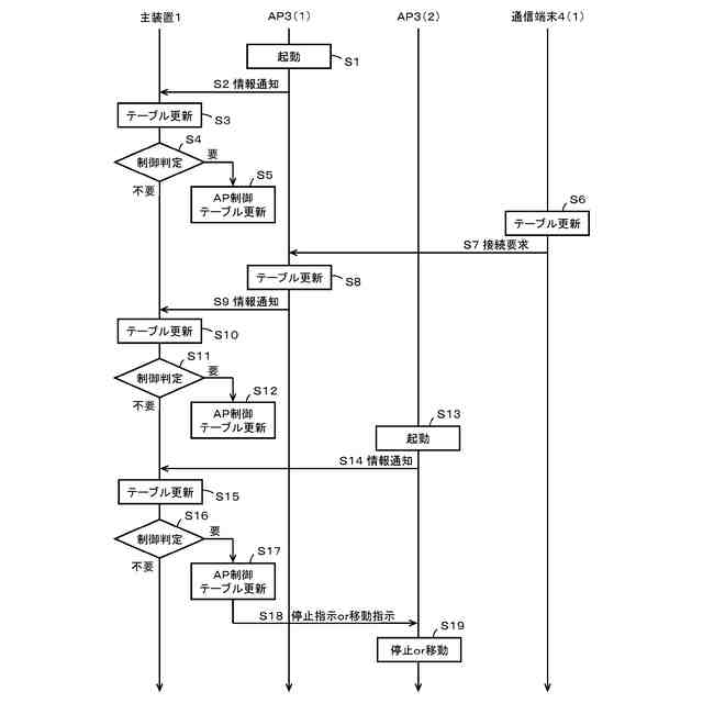 【解決手段】 アクセスポイント装置は、情報通知処理部を通じて、所定のタイミング毎に無線通信関連情報を主装置1に通知し、制御部によって、主装置1からの指示情報に応じて、自機の動作状態を制御する。主装置1は、接続端104Tを通じてアクセスポイント装置からの無線通信関連情報を受信し、テーブル更新部121によって、受信した無線通信関連情報に基づいてAP管理テーブル106を更新する。主装置1は、制御判定手部122によって、AP管理テーブル106の格納データに基づいて、アクセスポイント装置の制御が必要か否かを判定し、制御が必要な場合に、AP制御処理部123が、指示情報を形成して目的とするアクセスポイント装置に提供する。