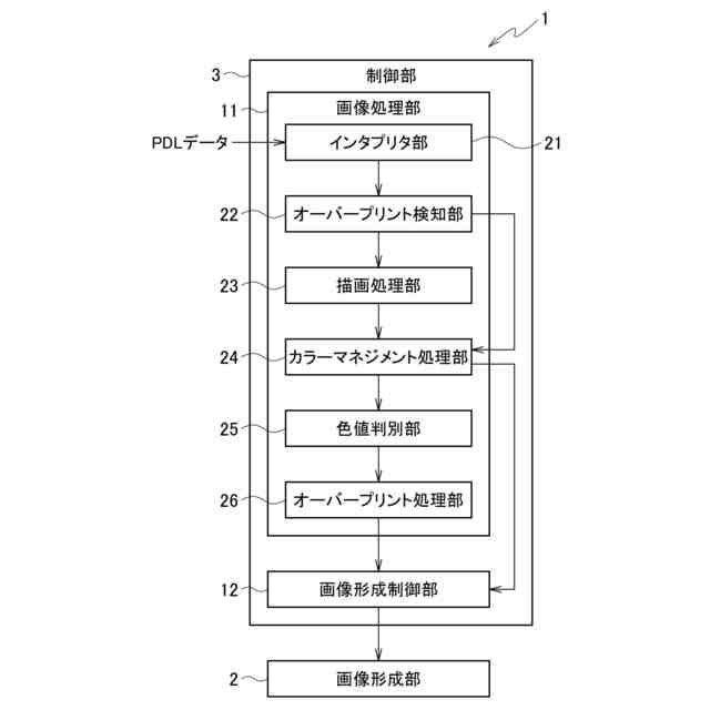画像データに画像処理を施して画像形成を行う画像形成装置において、画像処理の一環としてオーバープリント処理を行うことがある。オーバープリント処理は、画像データ中の背面のオブジェクト上に前面のオブジェクトを重ね、背面のオブジェクトの色を残したまま前面のオブジェクトの色を載せる処理である。