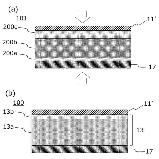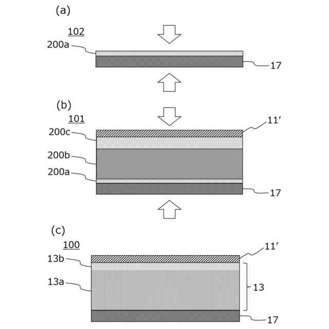 各層が圧着された前記積層体(2)と、リチウム金属からなるリチウム金属層と、リチウムと合金化可能な金属からなり前記第1の金属層よりも厚い第2の金属層と、がこの順に積層された積層体(1)を、前記積層体(1)の積層方向に加圧して各層を圧着することと、