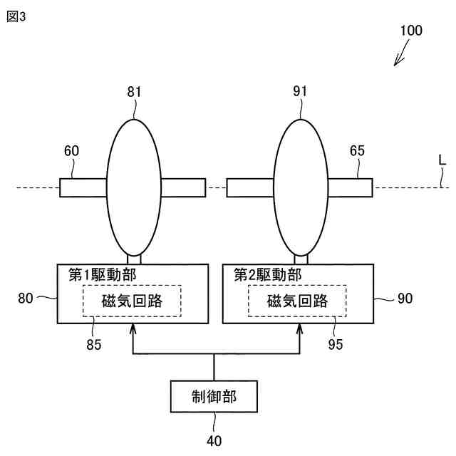 第2磁気回路によって、前記第1直線運動方向と同じ直線上にある第2直線運動方向に力を与え、前記カウンタウェイトを前記第2直線運動方向に直線運動させる第2駆動部と、