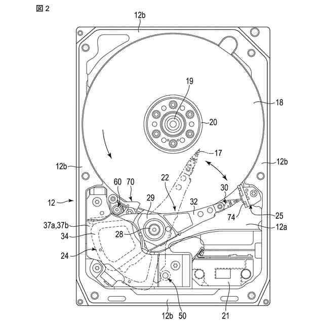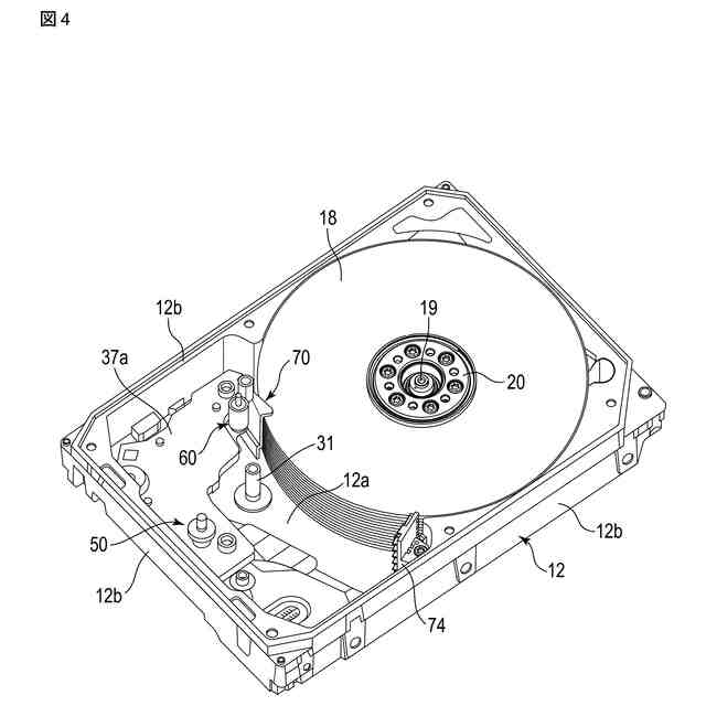 筐体10内には、ディスク状の記録媒体として複数枚、例えば、10枚の磁気ディスク18、および磁気ディスク18を支持および回転させるスピンドルモータ19が設けられている。スピンドルモータ19は、底壁12a上に配設されている。各磁気ディスク18は、例えば、直径96mm(3.5インチ)の円板状に形成され、非磁性体、例えば、ガラスあるいはアルミニウムからなる基板と、基板の上面(第1面)および下面(第2面)に形成された磁気記録層とを有している。各磁気ディスク18は、スピンドルモータ19のハブに互いに同軸的に嵌合され、更に、クランプばね20によりクランプされている。これにより、磁気ディスク18は、ベース12の底壁12aと平行に位置した状態に支持されている。複数枚の磁気ディスク18は、スピンドルモータ19により所定の回転数で回転される。なお、磁気ディスク18の搭載枚数は、10枚に限らず、9枚以下、あるいは、11枚以上としてもよい。