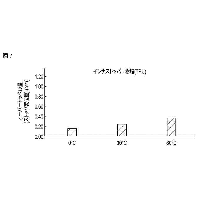 図7は、実施形態に係るインナストッパの衝突時のオーバートラベル量と温度との関係を示す図。
