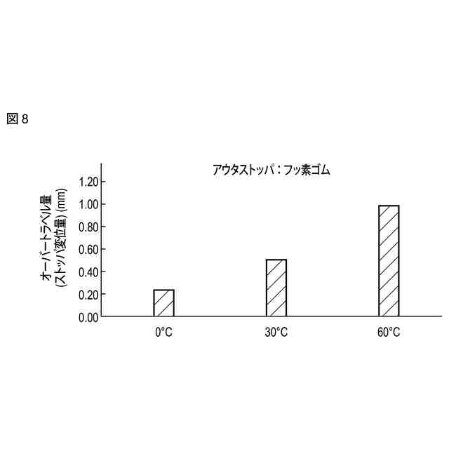 図8は、実施形態に係るアウタストッパの衝突時のオーバートラベル量と温度との関係を示す図。