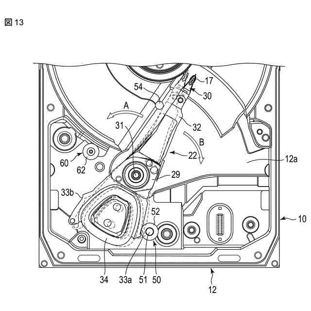 図1に示すように、HDDは、ほぼ矩形状の筐体10を備えている。筐体10は、上面の開口した矩形箱状のベース12と、複数のねじ13によりベース12にねじ止めされベース12の上部開口を閉塞するカバー(トップカバー)14と、を有している。ベース12は、カバー14と隙間を置いて対向する矩形状の底壁12aと、底壁12aの周縁に沿って立設された側壁12bとを有し、例えば、アルミニウム合金により一体に成形されている。側壁12bは、互いに対向する一対の長辺壁と互いに対向する一対の短辺壁とを含んでいる。カバー14は、例えば、ステンレスにより矩形板状に形成されている。カバー14は、その周縁部がねじ13により側壁12bの上面にねじ止めされる。