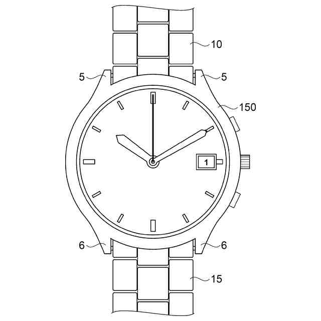 図2に示すように、第1バンド10の末端は、時計150の12時側のかん5に接続される。同様に、第2バンド15の末端は、時計150の6時側のかん6に接続される。なお、図2では、時計150を3針式のアナログ時計としているが、これに限定するものではなく、腕に装着する機器であれば良く、例えば、デジタル時計や、スマートウォッチであっても良い。
