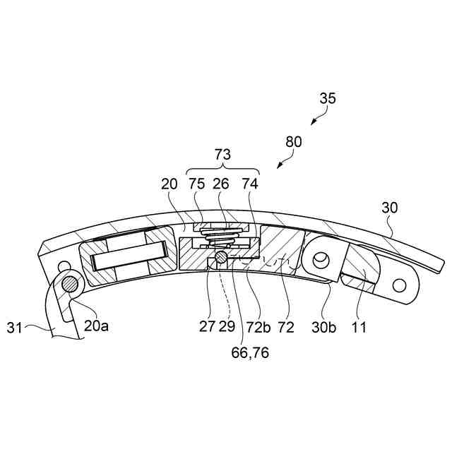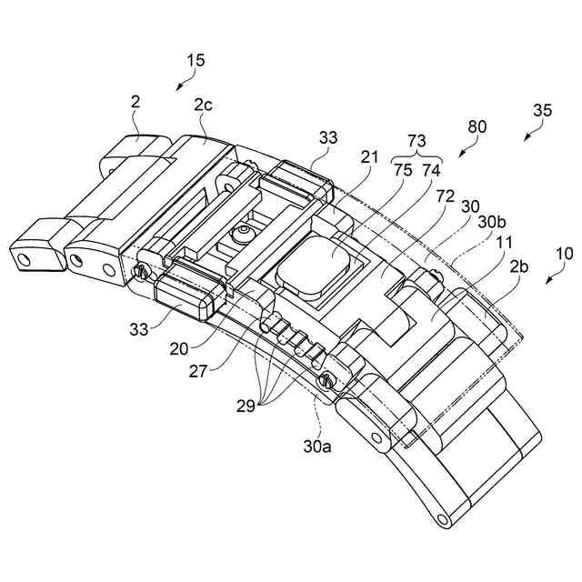 図1に示すように、バンド100は、第1バンド10と、第2バンド15と、第1バンド10と第2バンド15とを連結する中留部35などから構成されている。中留部35は、カバー部材30、中板31、下板32などから構成されており、カバー部材30の両側面に設けられたボタン33を押すことにより、ラッチピン41が解除され、図1に示すように展開して伸びる構成となっている。