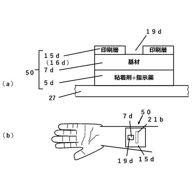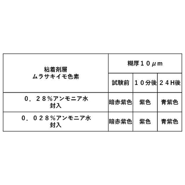 特許文献1に記載のガス感知体では、使用できる指示薬が挙げられているが、その中にはブロモクレゾールパープル(BCP)のように、皮膚刺激性を有するものもある。この対象物質感知シートにおいて、指示薬を含む粘着剤層は第1の基材に覆われているため、食品に直接触れる可能性は低いが、食品に触れない部分であっても安全性の高い材料で構成されていることが望ましい。