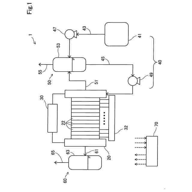 図1は、水電解システム1の構成を示す図である。水電解システム1は、水の電気分解により水素と酸素を生成する。水電解システム1は、複数の水電解セル22を積層したセルスタック20と、電源30と、セルモニタ32と、水供給部40と、酸素排出部50と、水素排出部60と、制御装置70とを備える。