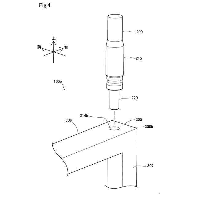 (3)上記形態のポップアップフード装置において、前記アクチュエータを前記ベース部材に対して固定する固定ピンを更に備え、前記アクチュエータの前記端部には第1貫通孔が設けられ、前記突出部には、前記収容部を貫くように第2貫通孔が設けられ、前記固定ピンは、前記アクチュエータの前記端部が前記収容部に収容された状態で、前記第1貫通孔と前記第2貫通孔とを貫くように配置されてもよい。