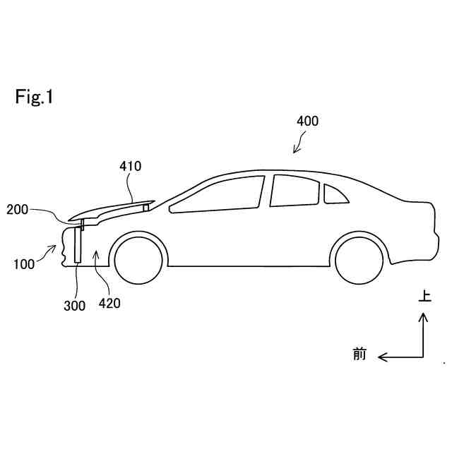 図1は、本開示の一実施形態としてのポップアップフード装置100が搭載された車両400を示す概略図である。車両400は、例えば、エンジンを搭載した車両、ハイブリッド車両(HEV)、プラグインハイブリッド車両(PHEV)、電気自動車(BEV)、燃料電池車両(FCV)などである。ポップアップフード装置100は、車両400に搭載されたセンサにより歩行者との衝突が検知または予知された場合に、フードパネル410を持ち上げることで歩行者への衝撃を抑制する。図1は、ポップアップフード装置100が作動してフードパネル410が持ち上げられた状態を示す。なお、図2以降の図では、ポップアップフード装置100が作動していない状態を示す。ポップアップフード装置100は、車両400のエンジンルーム420内の前方に配置されている。