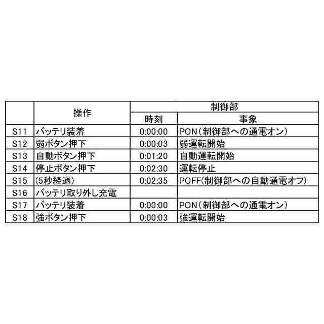 なお、バッテリ装着後、所定時間内に運転開始ボタン(例えば弱ボタン等)が押し下げされない場合、制御部は自身への通電を切り、非通電とする。このようにバッテリが装着された状態でかつ非通電状態では、ユーザが運転を開始するために運転開始ボタンを押すと、制御部に通電が開始される。制御部は、この時の時刻を基準時刻(0:00:00、即ち0時0分0秒)とし、この基準時刻から制御部への通電が停止された時刻までに生じた各事象を記録する。