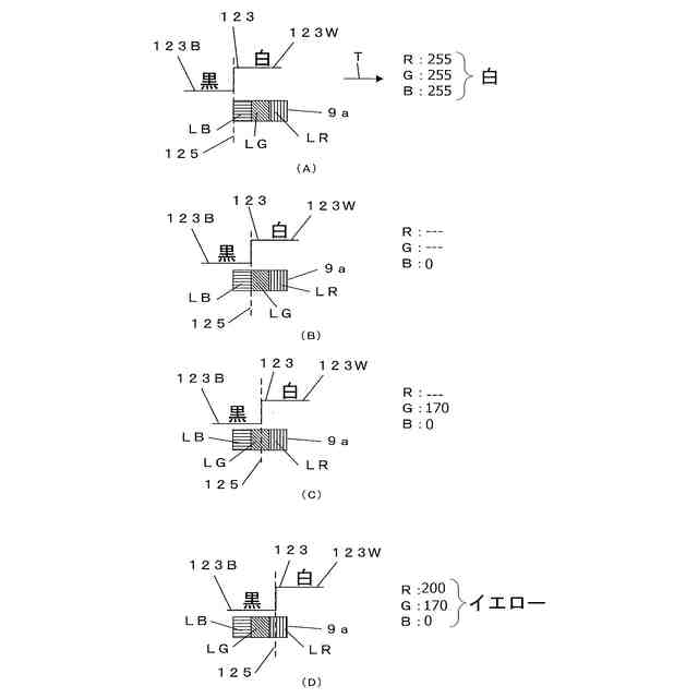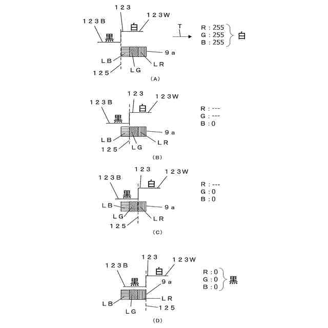 搬送速度に変化がなく、色ずれが発生しない場合の原稿とセンサRGBとの位置関係の変化について説明するための図であり、図3(A)は、黒色領域の取り込みを開始する直前における、原稿とセンサRGBとの位置関係を示し、図3(B)は、青色センサが黒色領域を取り込むタイミングにおける、原稿とセンサRGBとの位置関係を示し、図3(C)は、緑色センサが黒色領域を取り込むタイミングにおける、原稿とセンサRGBとの位置関係を示し、図3(D)は、赤色センサが黒色領域を取り込むタイミングにおける、原稿とセンサRGBとの位置関係を示す。