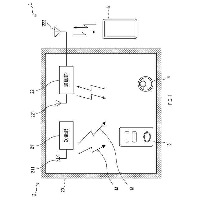 筐体は、少なくとも1つの充電装置(4)を収容するように構成される。通信部は、筐体の内部に配置され、少なくとも1つの充電装置と通信可能に構成される。送電部は、筐体の内部に配置され、少なくとも1つの充電装置に対して、電力供給用の電波である電力電波(M)を送信可能に構成される。