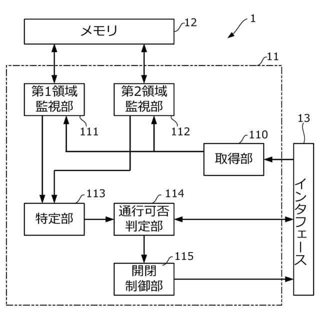 【解決手段】取得部110は、インタフェース13を経由して無線機24が受信した信号の情報を取得する。第1領域監視部111は、無線機24の両方が受信した信号の角度がそれぞれ第1条件を満たすか否かを判定する。第2領域監視部112は、無線機24の一方が受信した信号の角度と強度とが第2条件を満たし、かつ、他方が受信した信号の強度が第3条件を満たすか否かを判定する。特定部113は、第1領域監視部111及び第2領域監視部112から監視結果を取得し、携帯端末3が監視領域に存在すると認識された場合に、その携帯端末3が一つであるか否かを確認する。通行可否判定部114は、携帯端末3の認証情報をサーバ装置4に送信して問い合わせ、その結果に基づいて、携帯端末3による通路の通行の可否を判定する。