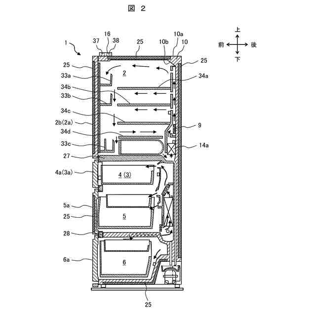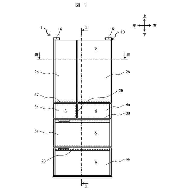 図1は、本発明の一実施例に係る冷蔵庫1の正面図である。図2は、本発明の一実施例に係る冷蔵庫1の縦断面図である。なお、図2は図1のII-II断面を図示している。