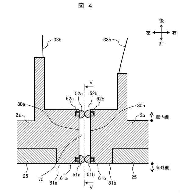 本発明の実施例4に係る左右扉境界部の横断面拡大図である。