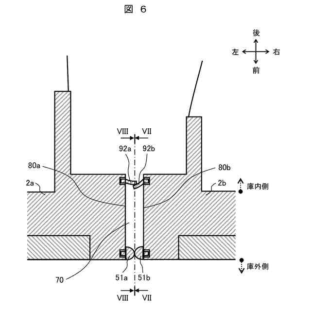 本発明の実施例5に係る左右扉境界部の横断面拡大図である。