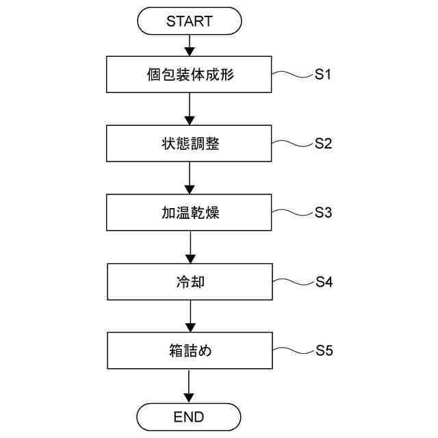 前記個包装体を加温乾燥させる工程と、前記個包装体を冷却する工程と、を一連のコンベアで前記個包装体を搬送する過程において行う