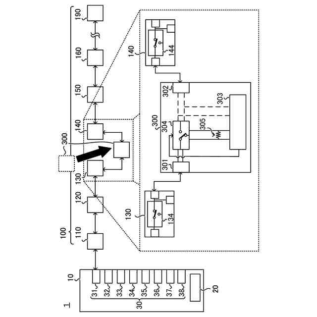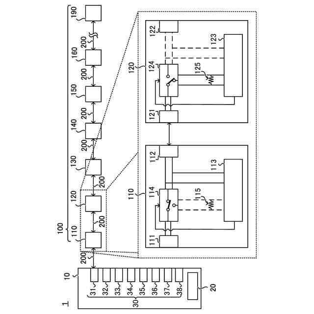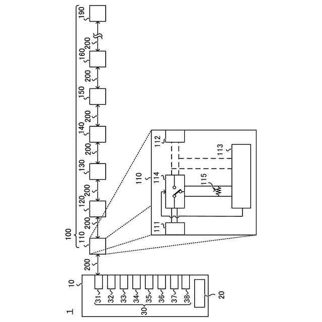 図1及び図2は、シリアル接続システム1の状態を示す概略図である。図1及び図2に示すシリアル接続システム1は、マスター10と複数のスレーブ100が通信配線200を介してシリアル接続されたシステムである。マスター10とスレーブ100の間及びスレーブ100間は、通信配線200によって接続されている。即ち、通信配線200は、マスター10とスレーブ100、または、スレーブ100と次のスレーブ100とを通信させるケーブルである。