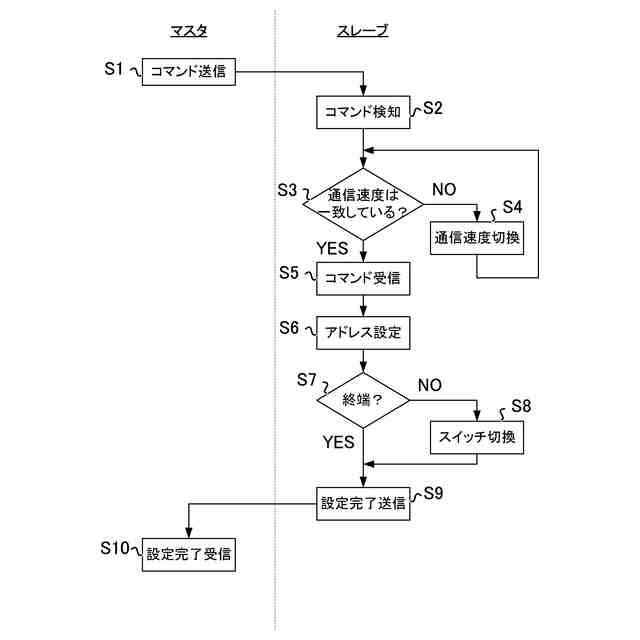該スレーブは、該コマンドによって通信速度を切り替えられる通信速度切り替え部と、該第1通信部と、該第2通信部と、終端抵抗と、該第2通信部と該終端抵抗の接続または該第1通信部と該第2通信部の接続に切り替え可能に該第2通信部と該終端抵抗に接続されたスイッチと、該コマンドによって該スイッチを操作し該第1通信部と該第2通信部の接続に切り替えるスイッチ制御部と、を備える、