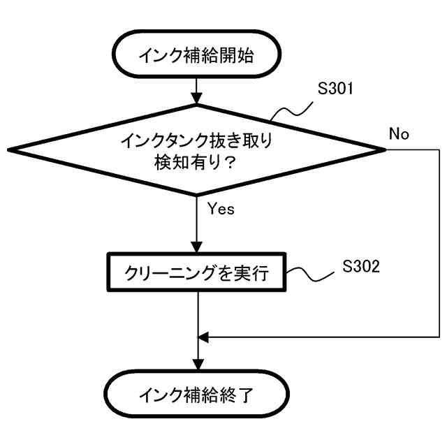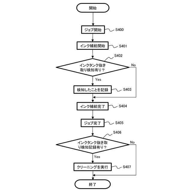 【解決手段】交換可能なインク容器を装着する装着部と、前記インク容器から補給されたインクを貯留する貯留手段と、前記貯留手段から供給されるインクを使用して印刷を行う印刷手段と、前記装着部から前記インク容器が取り外されたことを検知可能な検知手段と、前記インク容器から前記貯留手段にインクを補給する補給処理中に前記インク容器が前記装着部から取り外されたことが検知されたことに基づいて、前記装着部から前記印刷手段までのインクの流路上の少なくとも一部における気泡を排出するための特定の処理を実行するように制御する制御手段とを有する。