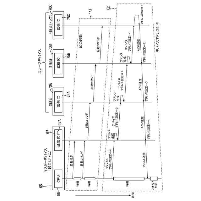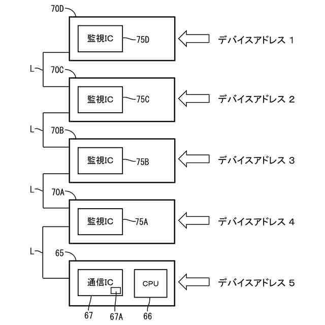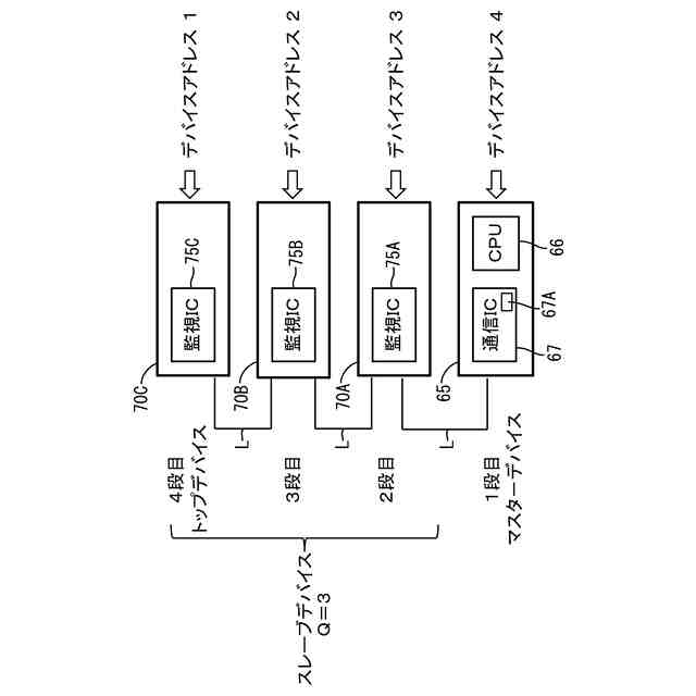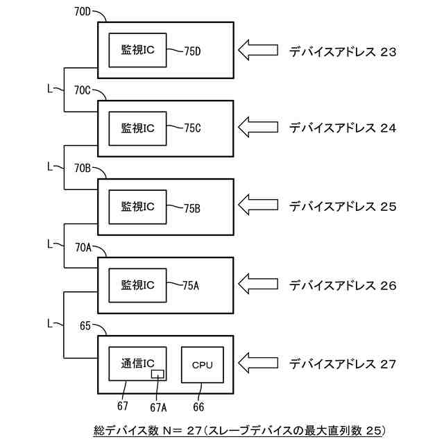 バンク監視装置(マスターデバイス)とモジュール監視装置(スレーブデバイス)をデイジーチェーン接続した通信形態において、モジュール監視装置の接続異常や通信異常を検出する技術が確立されていなかった。蓄電バンク用の監視装置に限らず、デイジーチェーン接続された機器(デバイス)は、同様の課題があった。