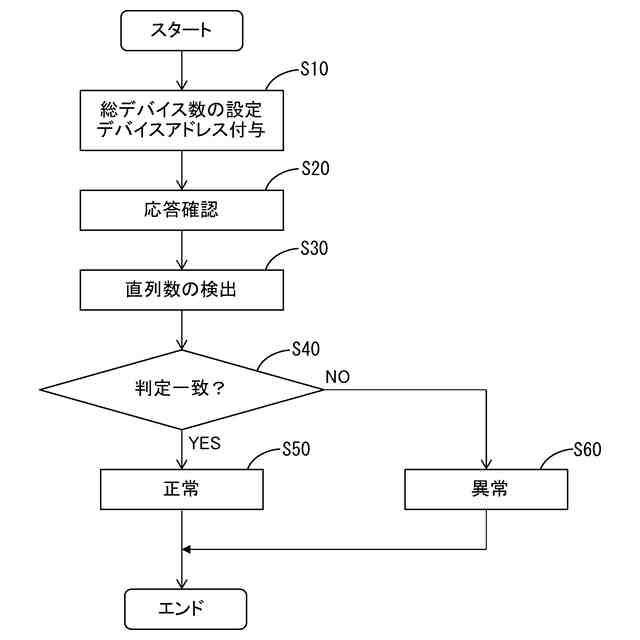 前記マスターデバイスは、全デバイスに連続したデバイスアドレスを付与後、前記通信線を介した通信により、複数の前記スレーブデバイスに対してそれぞれ応答確認を行う。前記マスターデバイスは、応答確認に成功したスレーブデバイスのデバイスアドレスに基づいて前記スレーブデバイスの直列数を検出し、検出した直列数を設定値と比較する。