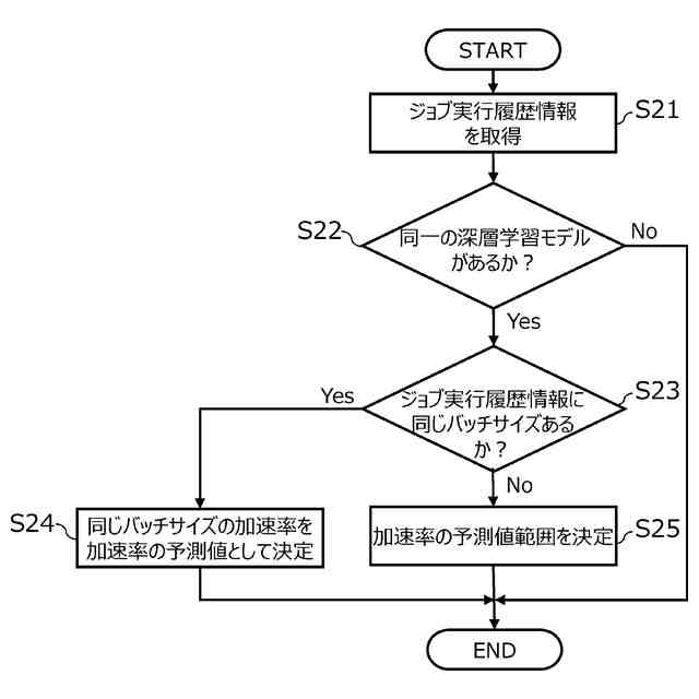 深層学習モデルについての処理対象のジョブに関する情報に基づき、深層学習モデルの種類とバッチサイズと加速率とを対応付けたプログラムの実行履歴を参照して、前記深層学習モデルの実行に伴う加速率の予測を行ない、